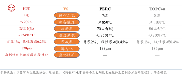HJT电池结构独特,量产平均转换效率优于PERC与TOPCon,尤其在双面率、温度系数、衰减率低等方面表现更优。