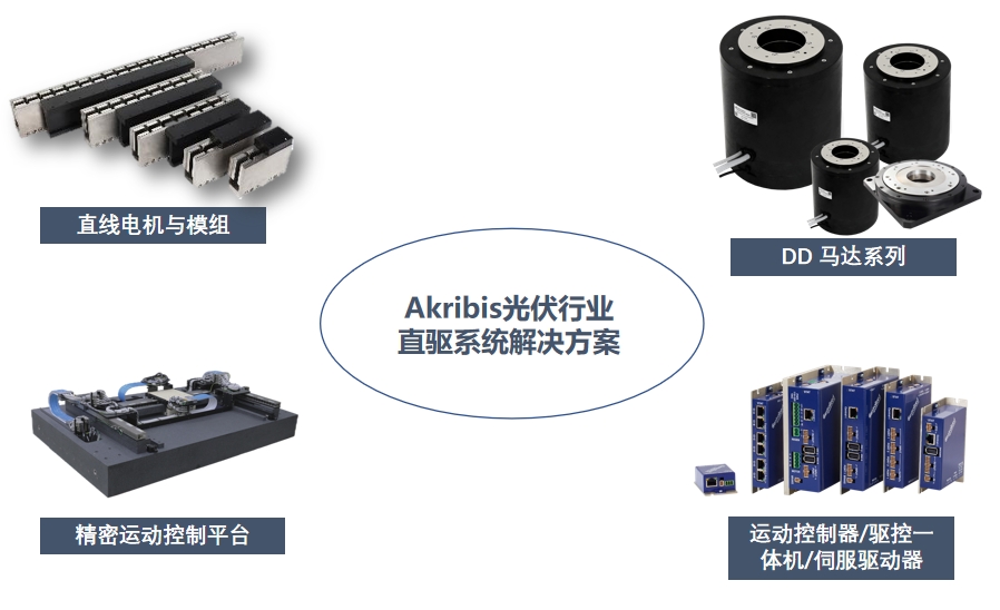 Akribis凭借在光伏行业多年的技术沉淀、研发定制等优势,提供完整的光伏行业直驱自动化产品解决方案,包含自动化控制系统、直线电机、DD马达以及各种精密运动平台等。产品线覆盖范围广,产品兼具高速、高加速度、高推力、运行时低噪音、免维护等特点,并且拥有多种冷却方式,可以显著提升机械的性能指标。